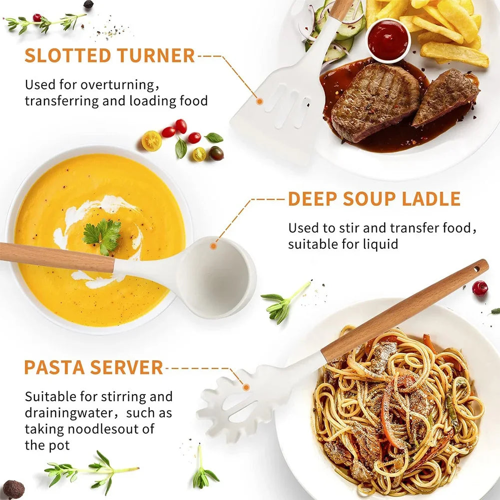 12Pcs Kitchen Utensil Set Heat-Resistant Cookware Wooden Handle Non-Stick Spatula Set Spatula Spoon Brush Whisk Kitchen Supplies